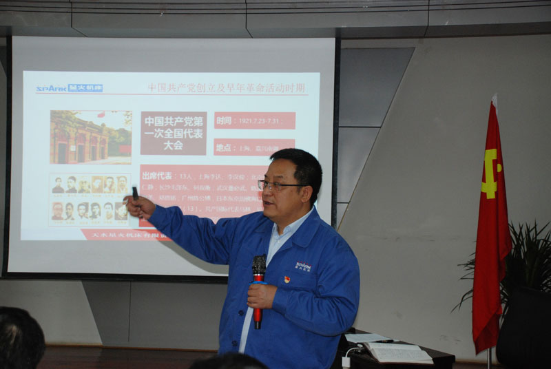 黨委書記、星火機(jī)床集團(tuán)公司董事長蔣保權(quán)為與會(huì)人員作了專題黨課輔導(dǎo)。蔣保權(quán)從人類歷史發(fā)展進(jìn)步、中國共產(chǎn)黨誕生前的歷史背景、中國共產(chǎn)黨發(fā)展壯大的歷史,以及各個(gè)時(shí)期黨經(jīng)受的考驗(yàn)和歷史轉(zhuǎn)折關(guān)頭領(lǐng)導(dǎo)全國各族人民不斷堅(jiān)定信仰、明確目標(biāo),從勝利走向勝利的光輝歷程。蔣保權(quán)指出,每個(gè)黨員都要了解黨的光輝歷史,提高修養(yǎng),嚴(yán)格用黨員標(biāo)準(zhǔn)規(guī)范自己言行,發(fā)揮好模范帶頭作用,堅(jiān)信只有共產(chǎn)黨才能救中國,只有共產(chǎn)黨才能領(lǐng)導(dǎo)中國革命從勝利走向勝利,最終實(shí)現(xiàn)為中國人民謀幸福,為中華民族謀復(fù)興的中國夢。