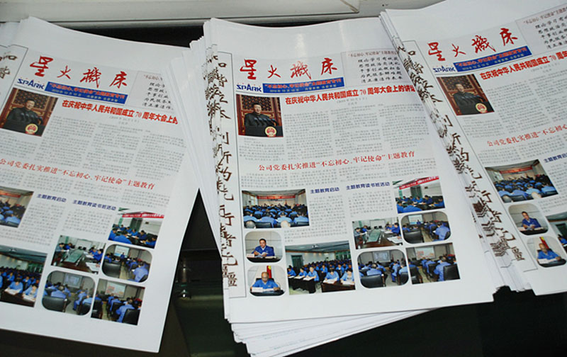 為使“不忘初心、牢記使命”主題教育往深里走,往實里做,幫助廣大黨員學(xué)懂弄通習(xí)近平新時代中國特色社會主義思想,掌握精髓,激發(fā)斗志,指導(dǎo)行動。10月18日,經(jīng)過認(rèn)真準(zhǔn)備的星火機床《“不忘初心、牢記使命”主題教育??泛蛷V大黨員見面了。本期??晒军h委工作部部長、公司“不忘初心、牢記使命”主題教育領(lǐng)導(dǎo)小組辦公室主任姚保忠策劃,黨委工作部有關(guān)人員精心組織稿件、選擇圖片進行編排。??粤?xí)近平總書記在慶祝中華人民共和國成立70周年大會上的講話為統(tǒng)領(lǐng),分欄目反映了公司“不忘初心、牢記使命”主題教育動員部署大會、主題教育讀書班、慶祝新中國成立70周年歌詠比賽,市委“不忘初心、牢記使命”主題教育第八巡回指導(dǎo)組指導(dǎo)檢查、專題黨課、“不忘初心、牢記使命”主題教育知識競賽,黨支部書記參加全市“不忘初心、牢記使命”主題教育培訓(xùn),公司黨員參觀全市慶祝新中國成立70周年成就展,公司黨委檢查督導(dǎo)基層支部黨建工作,以及公司主題黨日活動和優(yōu)秀黨員事跡介紹等。??噬∷ⅲ詧D為主、圖文并茂,既是對公司開展“不忘初心、牢記使命”主題教育的全面報導(dǎo),又是廣大黨員掌握主題教育動態(tài)、開展學(xué)習(xí)的輔導(dǎo)材料,受到了黨委領(lǐng)導(dǎo)的肯定和黨員的好評。