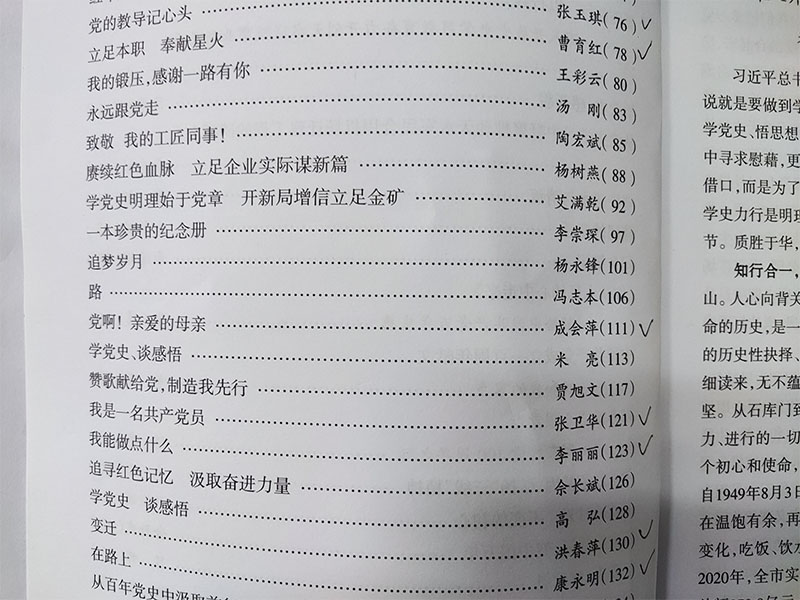 在2021年慶祝建黨100周年之際,天水市國(guó)資委、企工委組織開(kāi)展了“學(xué)黨史、談感悟”征文活動(dòng)。日前,主辦單位已將評(píng)選的42篇優(yōu)秀作品結(jié)集成冊(cè),其中星火機(jī)床公司七名職工的征文被收入其中。他們分別是退休職工張玉琪的《黨的教導(dǎo)記心頭》、物業(yè)公司曹育紅的《立足本職 奉獻(xiàn)星火》、行政綜合管理部成會(huì)萍的《黨??!親愛(ài)的母親》、鑄造公司張衛(wèi)華的《我是一名共產(chǎn)黨員》、物業(yè)公司李麗麗的《我能做點(diǎn)什么》、機(jī)床研究院洪春萍的《變遷》和黨群工作部康永明的《在路上》。