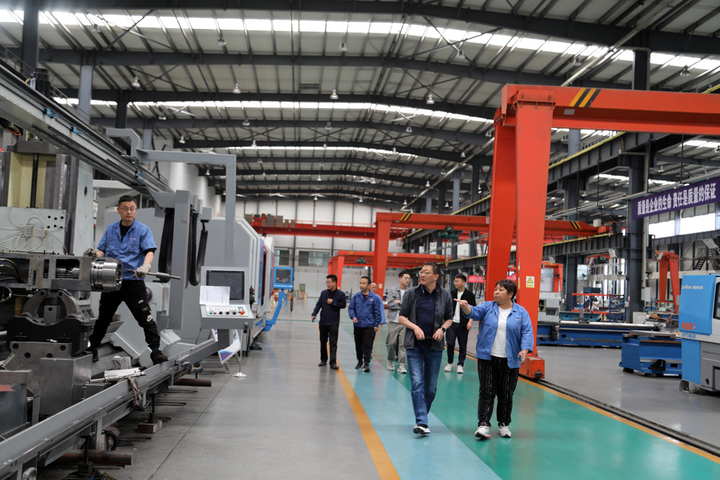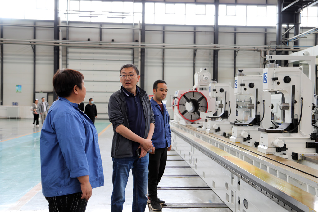 藺峰一行深入生產(chǎn)車間裝配現(xiàn)場,參觀生產(chǎn)場景和公司特色創(chuàng)新產(chǎn)品,在參觀調(diào)研中,展海瑜重點(diǎn)介紹了公司技術(shù)創(chuàng)新和發(fā)展經(jīng)營等情況,對公司自主研發(fā)生產(chǎn)的高端數(shù)控纏繞機(jī)床、高精度大型數(shù)控軋輥磨床、大型五軸聯(lián)動機(jī)床、船舶用超大直徑筒體加工專用機(jī)床等各類產(chǎn)品的特點(diǎn)、用途、應(yīng)用領(lǐng)域及市場前景做了詳細(xì)講解。并就目前產(chǎn)業(yè)政策、產(chǎn)業(yè)集群和產(chǎn)業(yè)協(xié)同發(fā)展等方面問題與藺峰一行作了深入交流。