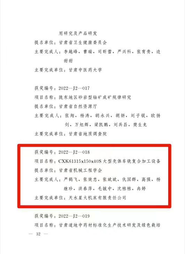 日前,甘肅省人民政府對(duì)在我省科學(xué)技術(shù)進(jìn)步、經(jīng)濟(jì)社會(huì)發(fā)展中作出突出貢獻(xiàn)的科學(xué)技術(shù)人員和組織進(jìn)行了評(píng)審獎(jiǎng)勵(lì)。由星火機(jī)床集團(tuán)公司機(jī)床研究院科研人員嚴(yán)鶴飛、張效忠、張斌斌、仇國(guó)群、高強(qiáng)、楊繼珍、洪春萍、毛毓中、沈棟棟、冉婷研發(fā)的CXK61315x150x40S大型殼體車銑復(fù)合加工設(shè)備榮獲甘肅省科學(xué)技術(shù)進(jìn)步獎(jiǎng)二等獎(jiǎng)。
