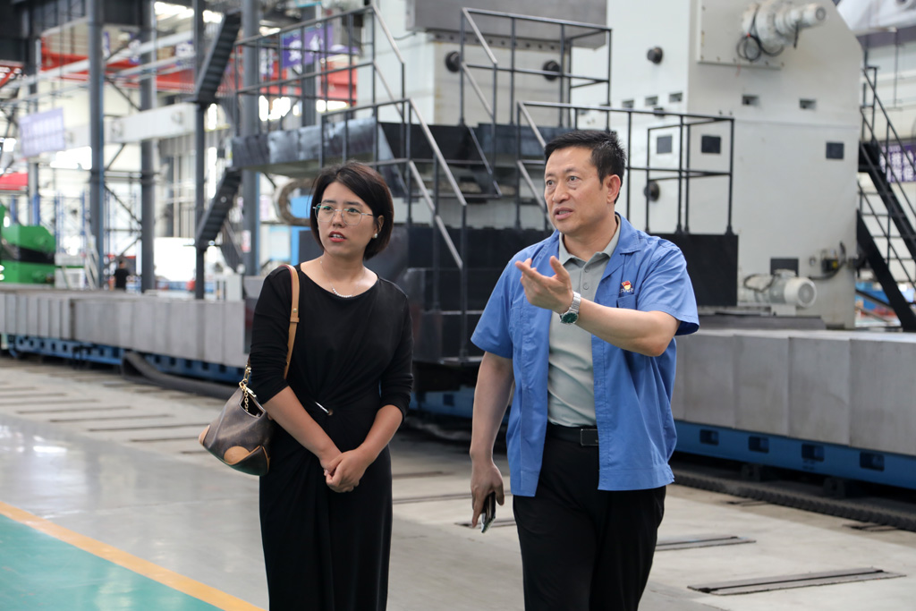 在裝配生產(chǎn)現(xiàn)場,總經(jīng)理劉勝向羅瑛娜一行詳細(xì)介紹了公司發(fā)展歷程、技術(shù)創(chuàng)新、產(chǎn)品性能以及在航空航天、軍工、船舶、工程機械等領(lǐng)域的應(yīng)用等情況,并陪同參觀了公司研發(fā)生產(chǎn)的各類大、重型機床產(chǎn)品。