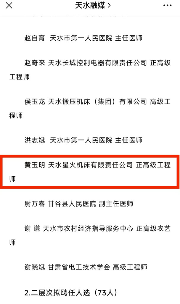 日前,天水市領(lǐng)軍人才第三批入選名單公布,星火機床集團公司機床研究院數(shù)控系列產(chǎn)品總設(shè)計師、正高級工程師黃玉明入選第三批第一層次。