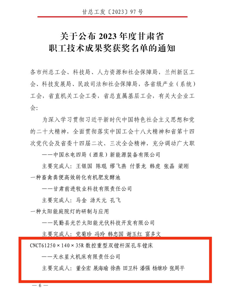 日前,省總工會、省科學技術(shù)廳、省人力資源和社會保障廳聯(lián)合公布了第十六屆(2023年)甘肅省職工優(yōu)秀技術(shù)創(chuàng)新成果獲獎名單,星火機床公司董全宏、展海瑜等人完成的CNCT61250×140×35R 數(shù)控重型雙鏜桿深孔車鏜床榜上有名,榮獲二等獎。