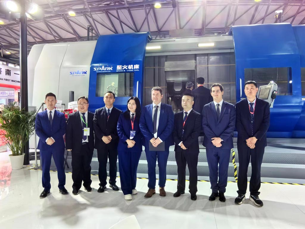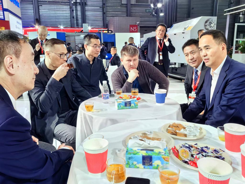 俄羅斯軌道交通集團客商一行在華中數(shù)控國際事業(yè)部王雪松的陪同下來到公司展位參觀洽談。