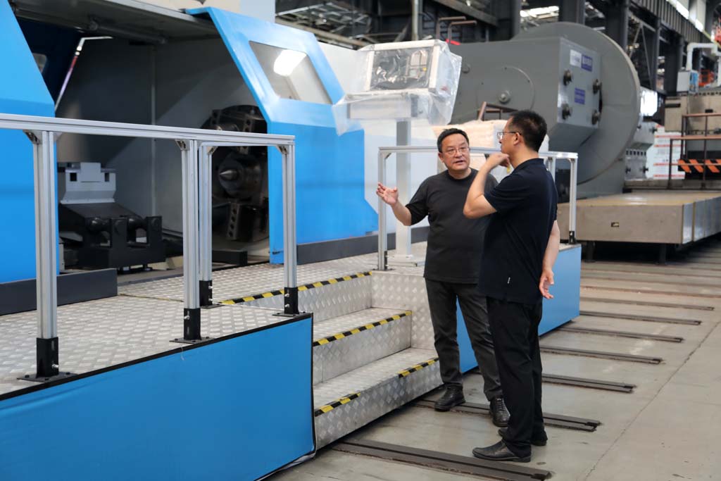 劉建一行在蔣保權陪同下參觀了工業(yè)園加工車間和各類產品裝配現場,向調研組重點介紹了生產裝配中的數控重型臥式車床、車輪車床以及五軸聯(lián)動機床等典型設備,并簡單回顧了企業(yè)的發(fā)展歷程和歷史沿革。