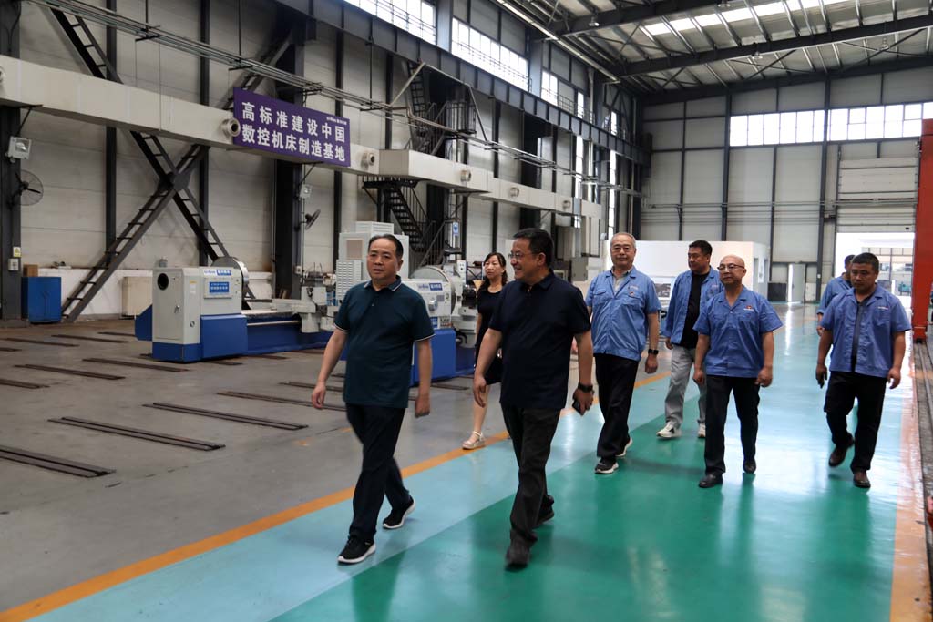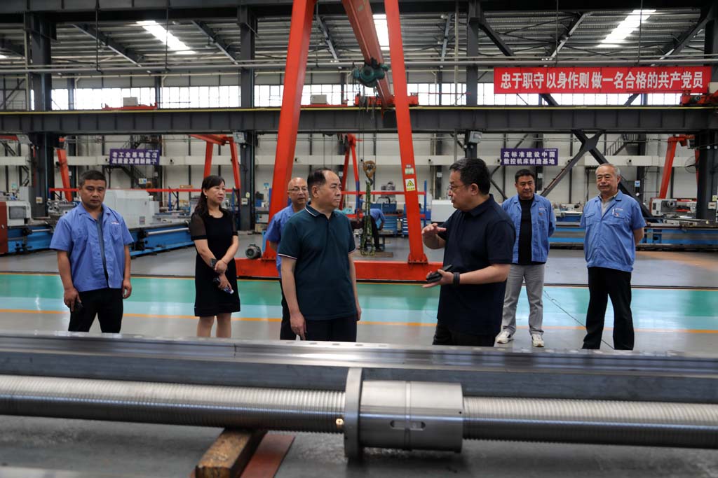 梅學(xué)千一行在蔣保權(quán)陪同下參觀了工業(yè)園裝配車間、青重加工車間以及噴漆車間,蔣保權(quán)向梅學(xué)千介紹了車間生產(chǎn)裝配中的長軸車床、車輪車床以及五軸聯(lián)動機床等典型設(shè)備,并就產(chǎn)品的國產(chǎn)化率以及產(chǎn)品涉及的材料技術(shù)、制造技術(shù)等細節(jié)問題進行了溝通交流。