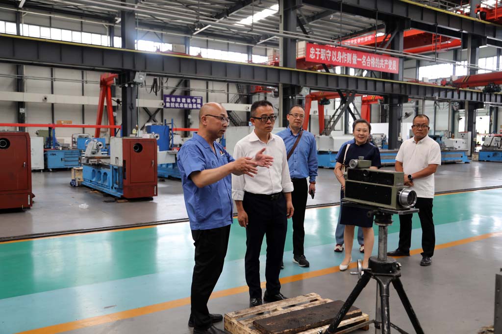 周勝一行在蔣俊陪同下深入工業(yè)園加工車間、裝配車間以及青重公司生產車間,參觀了裝配中的各類車床產品,了解了車床裝配流程。考察中,蔣俊就公司生產經營、市場規(guī)模、智能制造、人才培訓、科技研發(fā)等情況向周勝一行作了介紹,并結合裝配中的產品介紹了五軸聯(lián)動機床、軋輥磨床以及青重車輪車機床等產品的性能特點、市場前景以及應用領域等。蔣俊說,星火機床作為曾經的“三線”企業(yè),經過多年的摸爬滾打,在地區(qū)裝備制造業(yè)中占有一席之地,近年來,公司搶抓國家大力發(fā)展裝備制造業(yè)的機遇,堅持以市場為導向進行創(chuàng)新研發(fā),開發(fā)了一系列新產品,得到了市場的認可。