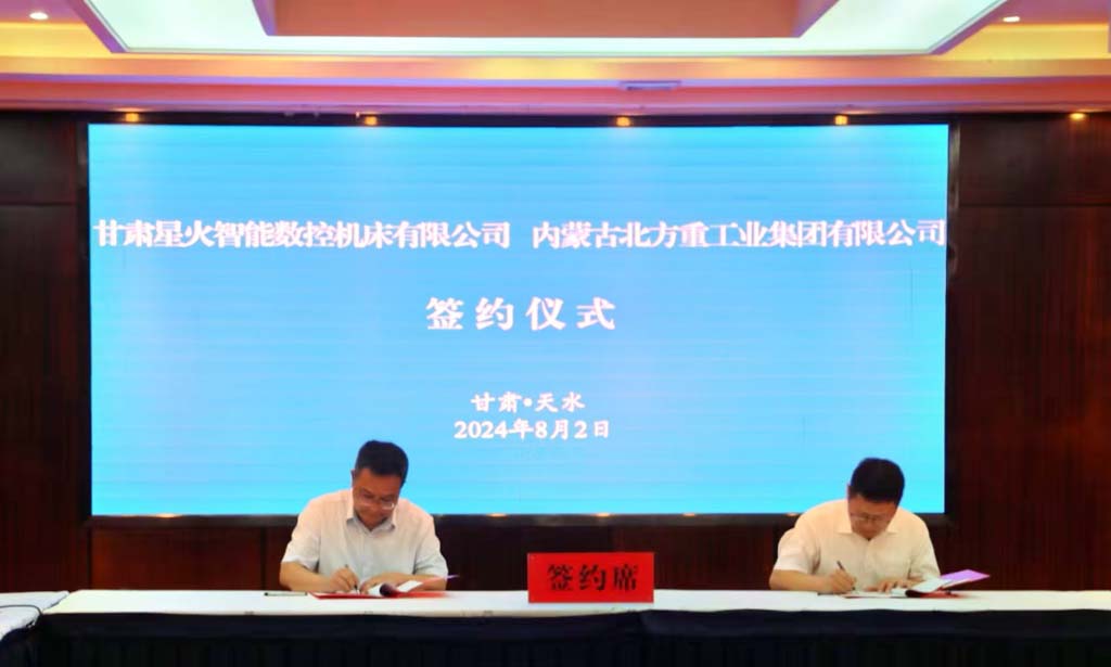 甘肅星火智能數(shù)控機(jī)床有限公司黨委書(shū)記、董事長(zhǎng)蔣保權(quán),內(nèi)蒙古北方重工業(yè)集團(tuán)有限公司副總經(jīng)理華金虎代表雙方企業(yè)簽署合作協(xié)議。