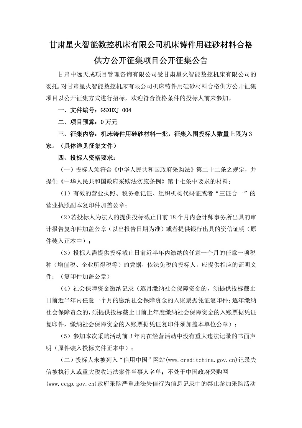 甘肅星火智能數(shù)控機(jī)床有限公司機(jī)床鑄件用硅砂材料合格供方公開征集項(xiàng)目公開征集公告