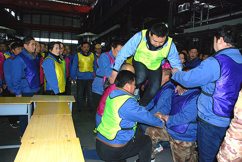 第二天,拓展培訓(xùn)繼續(xù)進(jìn)行。早上8點(diǎn),培訓(xùn)老師帶領(lǐng)大家進(jìn)行情景模擬沙盤TTT標(biāo)準(zhǔn)課程——“沙漠掘金”。游戲的目的是鍛煉管理者的決策能力、目標(biāo)管理能力及團(tuán)隊(duì)的執(zhí)行能力、合作精神等。經(jīng)過(guò)沙盤模擬演練操作,10個(gè)隊(duì)中有5個(gè)隊(duì)因計(jì)劃不周、對(duì)天氣情況缺乏精準(zhǔn)的判斷而導(dǎo)致“彈盡糧絕”,中途退出;2個(gè)隊(duì)因私下互換物品,違反游戲規(guī)則,被老師罰出局,最終僅有3支隊(duì)“活著”回到駐地,老師為獲得了第一名的隊(duì)頒發(fā)了獎(jiǎng)勵(lì)金。下午進(jìn)行了“盜夢(mèng)空間”及“星火是最棒的”游戲項(xiàng)目。最后一個(gè)訓(xùn)練項(xiàng)目“搶渡金沙江”,將本次培訓(xùn)達(dá)到了高潮。此活動(dòng)展示的場(chǎng)景為:我方隊(duì)伍需要渡過(guò)金沙江,但橋墩已被破壞,后有追兵,40分鐘就會(huì)趕到。這時(shí)候,就需要10個(gè)人,2人一組,單膝跪地,左右手交疊,模擬“橋墩”,讓隊(duì)友從自己手背上踩過(guò)去,在追兵趕到之前全部渡江。渡江過(guò)程中,若團(tuán)隊(duì)成員有一個(gè)違反跑、跳、躍、跪、爬等違規(guī)動(dòng)作,就得全體重新開始。規(guī)則明確后,隊(duì)長(zhǎng)從自愿當(dāng)“橋墩”的隊(duì)員里選定10人?;顒?dòng)開始,大家依次迅速“渡江”。遺憾的是,由于中途有隊(duì)員違反規(guī)則,“渡江”行動(dòng)反復(fù)了3次。近60人幾次踩著10名“橋墩”的手背連續(xù)“渡江”,“橋墩”們的膝蓋和胳膊達(dá)到了支撐極限,手背布滿了黑黑的鞋印,可他們沒有一句抱怨、沒有絲毫退縮。震撼的場(chǎng)景、“橋墩”們默默的付出,感動(dòng)著大家,隊(duì)友們含淚從他們手上踩過(guò),現(xiàn)場(chǎng)發(fā)出陣陣抽泣聲。此時(shí)此刻,人與人之間的距離在拉近,心與心在靠攏,感情在悄悄的升溫,大家不僅是同事,更是生死與共的兄弟姐妹。正如培訓(xùn)老師所講,一路走來(lái),有沒有想過(guò),我們的領(lǐng)導(dǎo)、我們的同事、我們的家人曾經(jīng)為自己所做的,我們又為他們做了哪些?作為“橋墩”,既然選擇了自己的路,就要無(wú)怨無(wú)悔的走下去,這是你的使命。