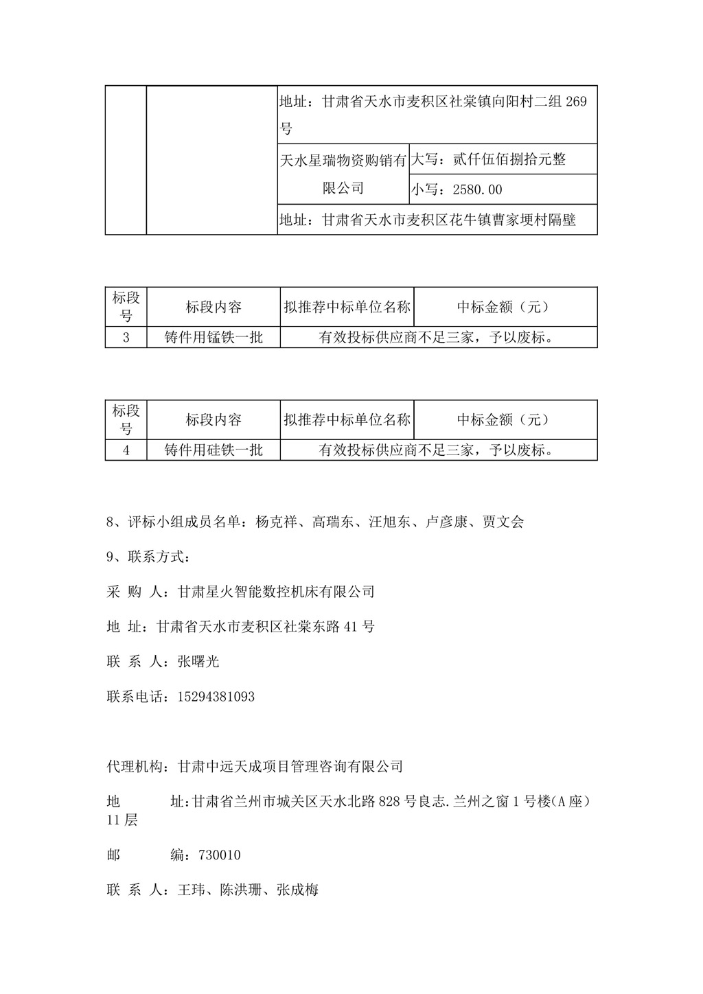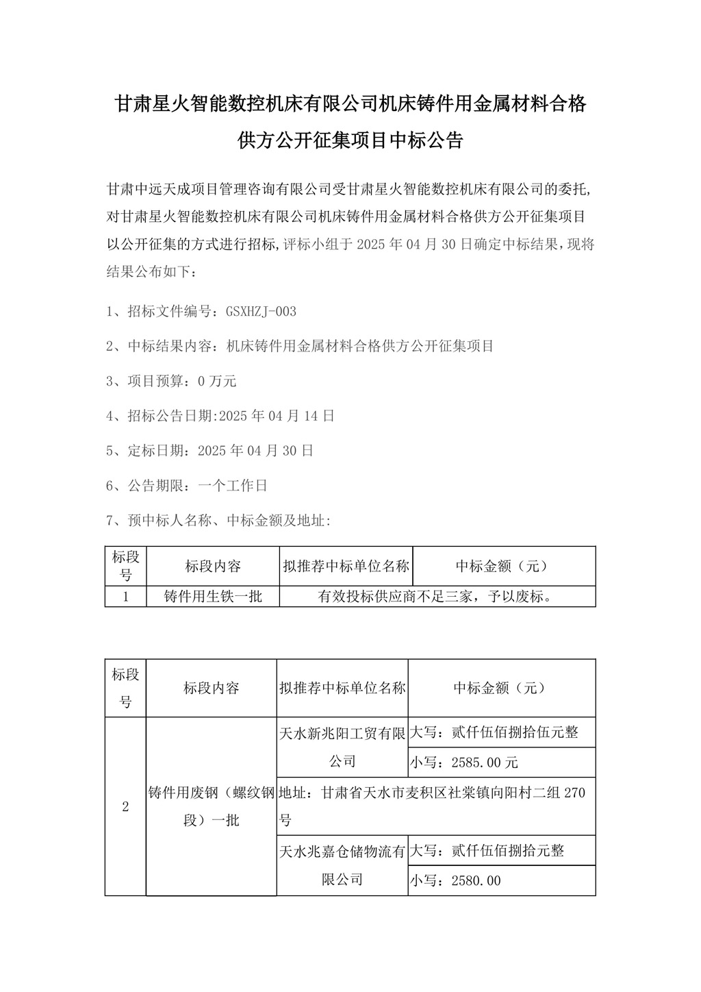 甘肅星火智能數(shù)控機(jī)床有限公司機(jī)床鑄件用金屬材料合格供方公開(kāi)征集項(xiàng)目中標(biāo)公告