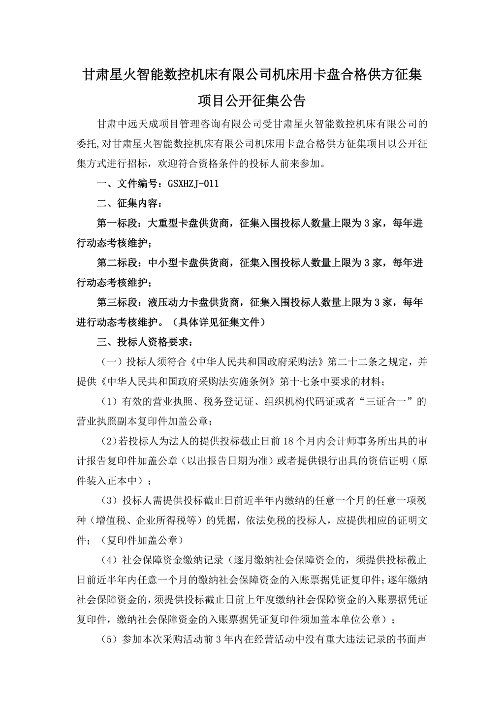 甘肅星火智能數(shù)控機(jī)床有限公司機(jī)床用卡盤合格供方征集項(xiàng)目公開(kāi)征集公告